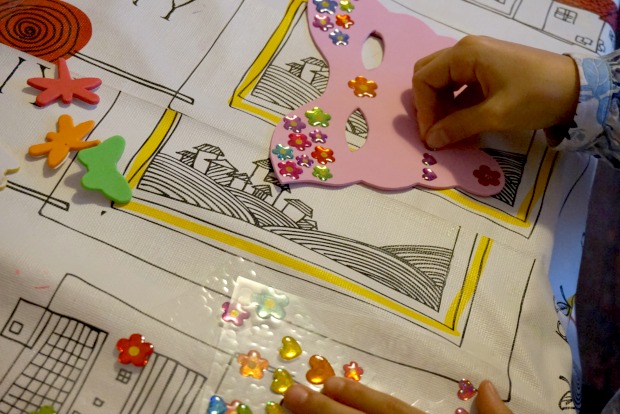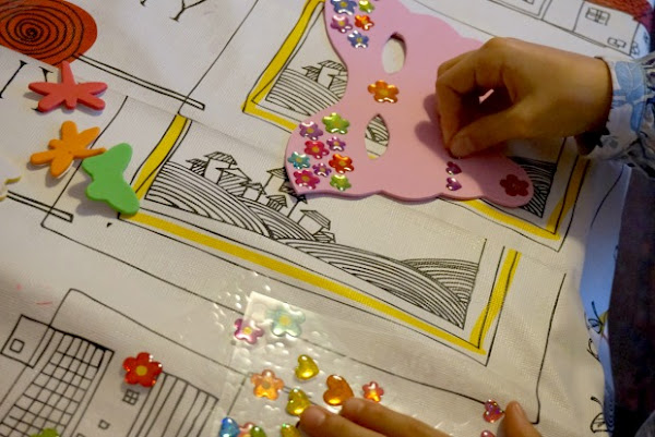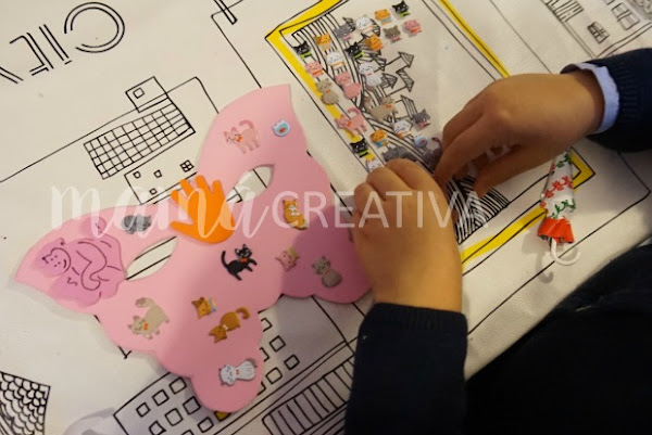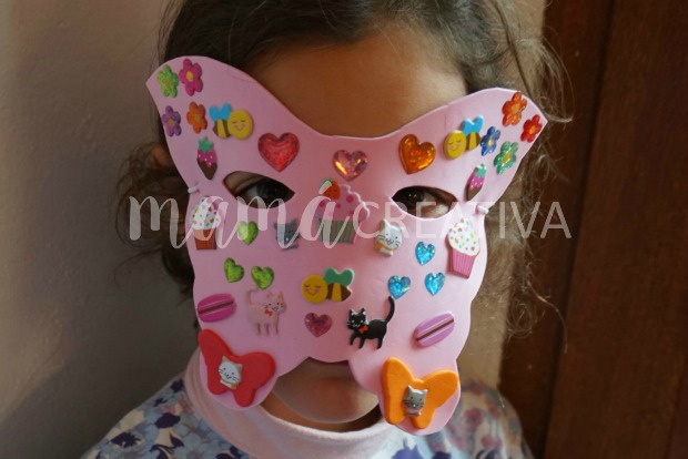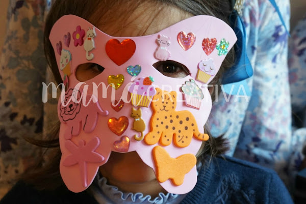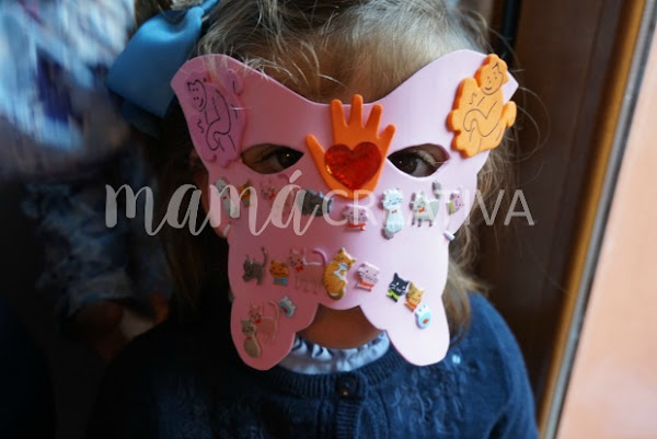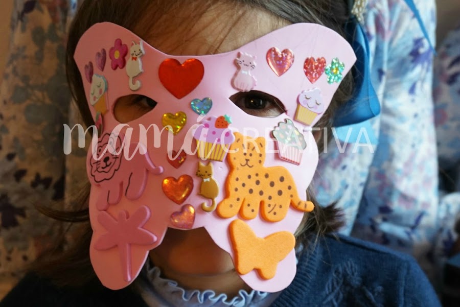 La primera de ellas fue decorar unas máscaras de goma eva con pegatinas y adhesivos, aunque se pueden pintar en vez de utilizar estas pegatinas.