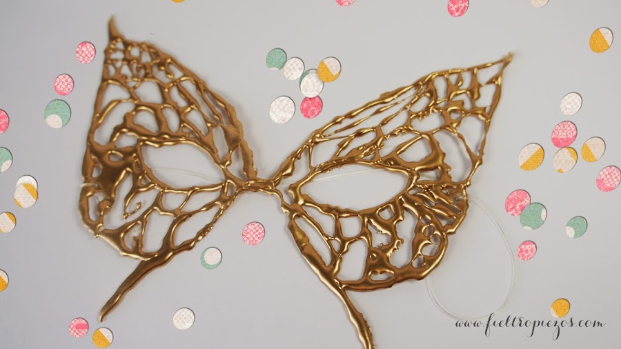 Si quieres pintar tu máscara, este es el momento. Yo lo hice con pintura en spray, color oro cromado. Pero dependiendo de qué sea tu disfraz, te irá mejor un color u otro. Aquí te dejo algunos consejos:
