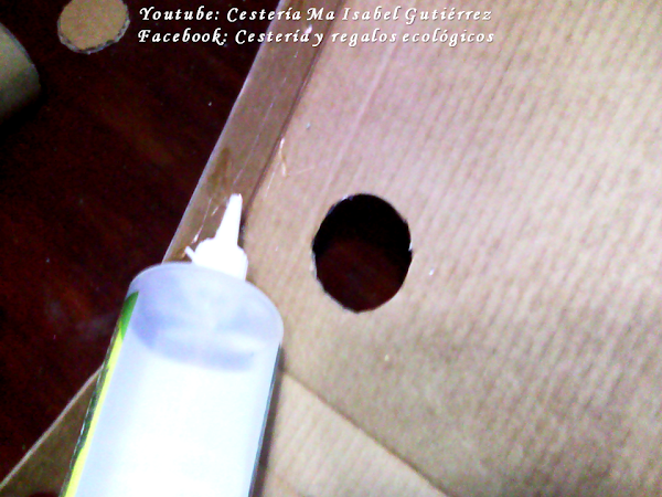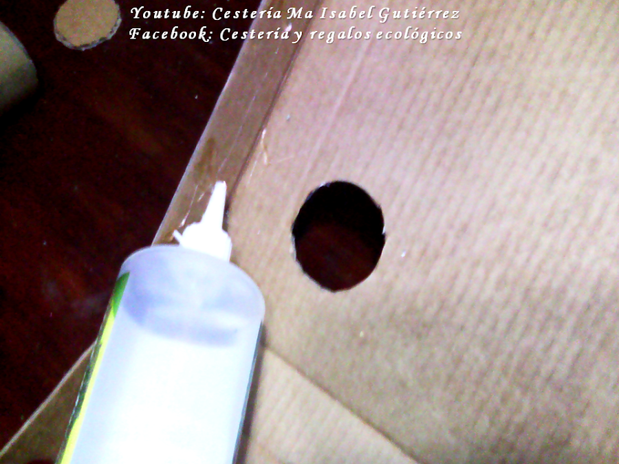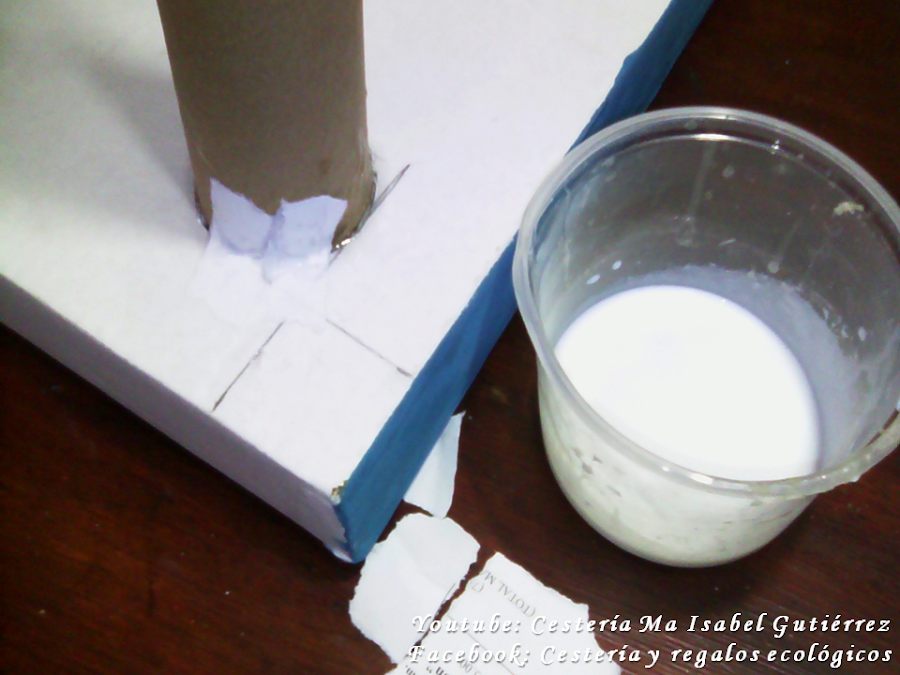 Para reforzar, aplicamos dos capas de cartapesta, pegando pequeños pedazos de papel alrededor de la unión de los tubos de cartón y la caja, pegando con una mezcla muy aguada de pegamento blanco y agua. Si quedara alguna imperfección por arriba o los lados de la caja, también aplicamos cartapesta...