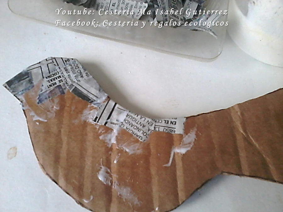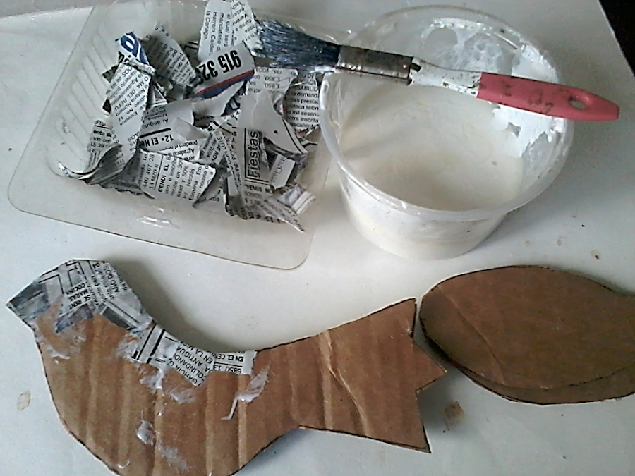 Aparte, cortamos pedazos pequeños de papel, deben ser cortados con nuestras manos y no con tijeras, esto es para que no se hagan relieves al momento de pegar. Mezclamos pegamento o cola blanca con agua y pegamos alrededor de todo el cuerpo y las alas, damos dos capas, dejando secar entre capa y capa...