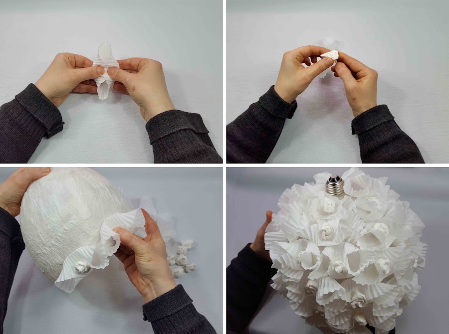 Damos forma a los moldes y hacemos las flores con el mismo papel ( En el vídeo os muestro cómo se hacen las flores ). Cuando tengamos suficientes, pegamos por toda la pantalla. Colocamos la bombilla y ya está lista para colgarla.