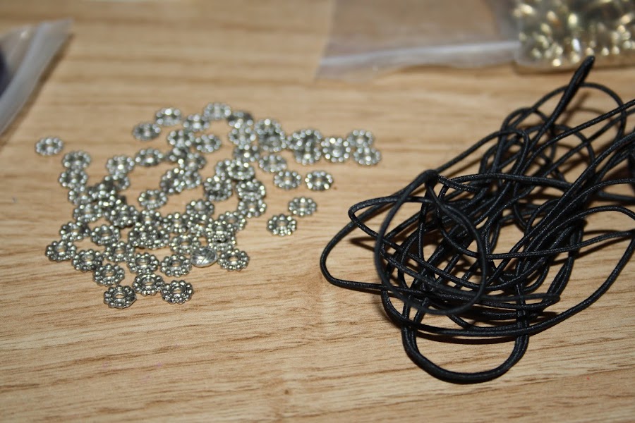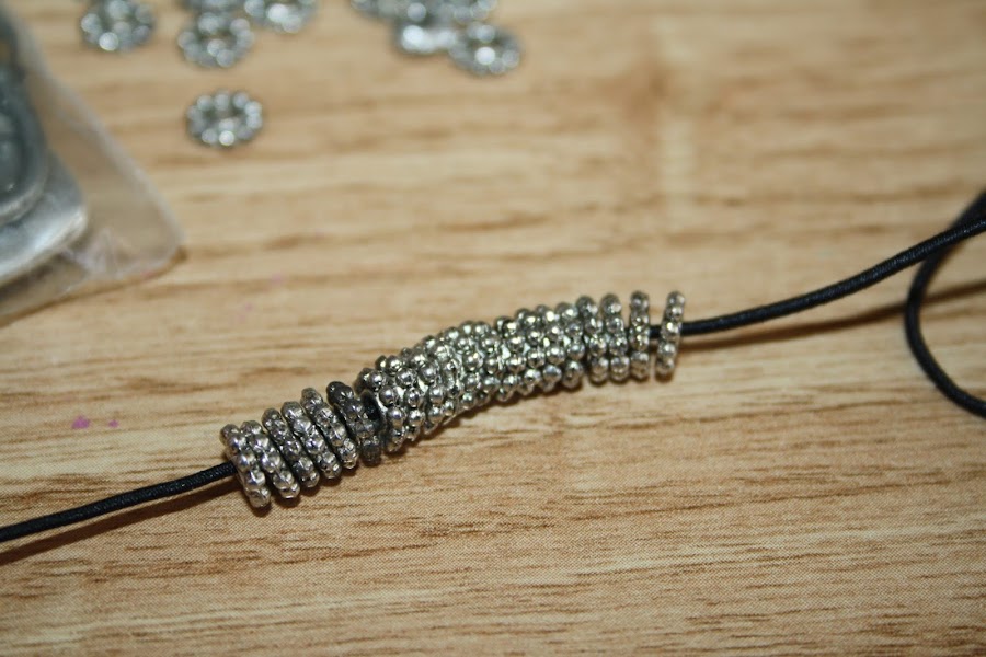 Cogemos la goma elástica y vamos metiendo las anillas. Pueden ser abalorios decorados, o lo que tengáís en casa. No es necesario que compréis nada, seguro que por ahí tienes algo que no usas y de eso se trata, de aprovechar lo que ya tenemos.