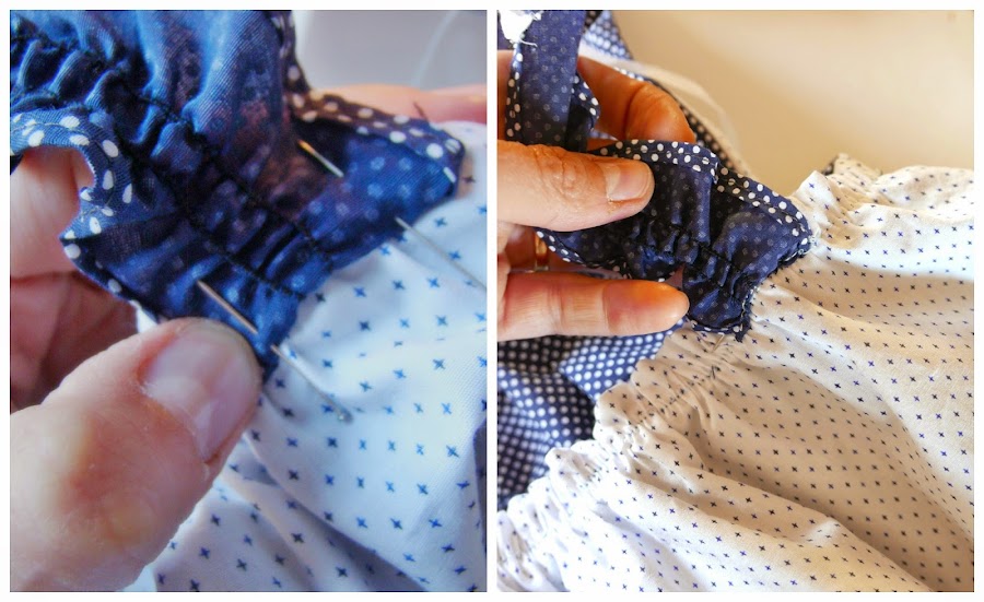 11. Cosemos dos penpuntes en la parte central con hilo elástico en la zona de la canilla, sólo a hasta la parte señalada en el patrón