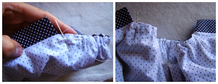 7. Hilvanamos la goma por la línea que indica el patrón, todo alrrededor de la cintura y después pasaremos un pespunte por el centro de la goma.