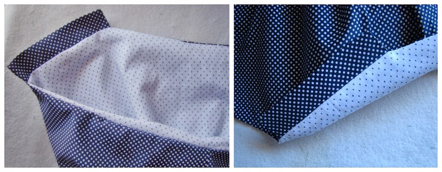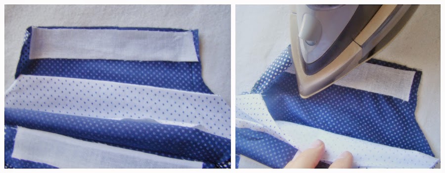 Ahora comenzamos a coser la zona de entrepierna, que es sólo para la ranita, si queremos hacer un vestido tendremos que seguir las marcas señaladas en el patrón, para ello y terminar el bajo como queramos, cerrado cosido y vuelto o como dos faldas independientes, exterior y forro. 12. Planchamos en la zona de la entrepierna unos rectágulos de entretela, en el revés de la tela exterior, para der consistencia