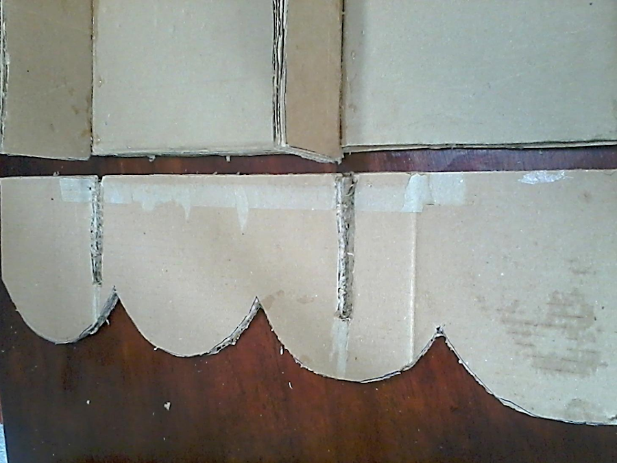 En base a este molde, recortamos la parte de arriba de los tres rectángulos de cartón; hecho esto, con pegamento o cola blanca, pegamos entre sí las tres piezas de cartón, ponemos algo pesado encima y dejamos secar...