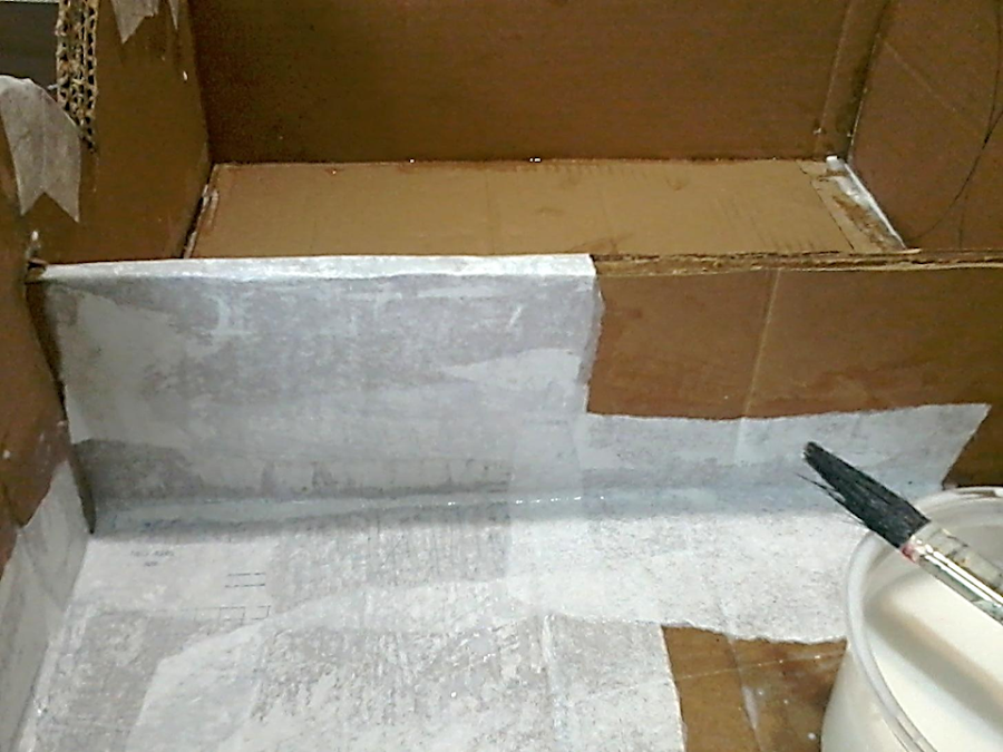 A continuación, vamos a hacer cartapesta a toda la repisa, pegando pedazos pequeños de cualquier papel, éste deben ser cortado con las manos y no con tijeras, para que al terminar no se noten mucho los relieves... Pegamos dos capas de cartapesta, con una mezcla muy aguada de pegamento o cola blanca con agua.