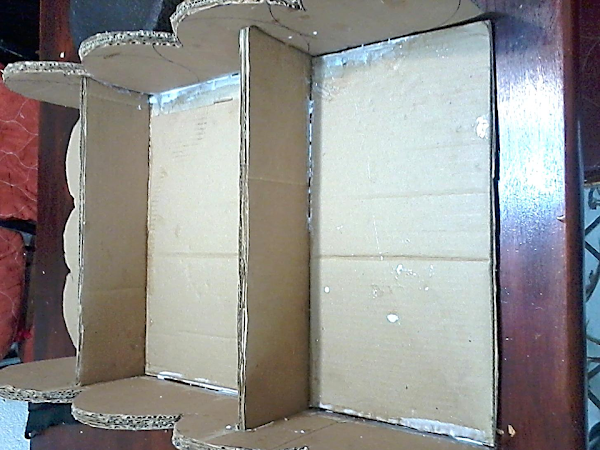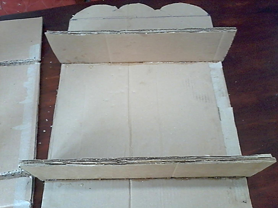 En base a este molde, recortamos la parte de arriba de los tres rectángulos de cartón; hecho esto, con pegamento o cola blanca, pegamos entre sí las tres piezas de cartón, ponemos algo pesado encima y dejamos secar...