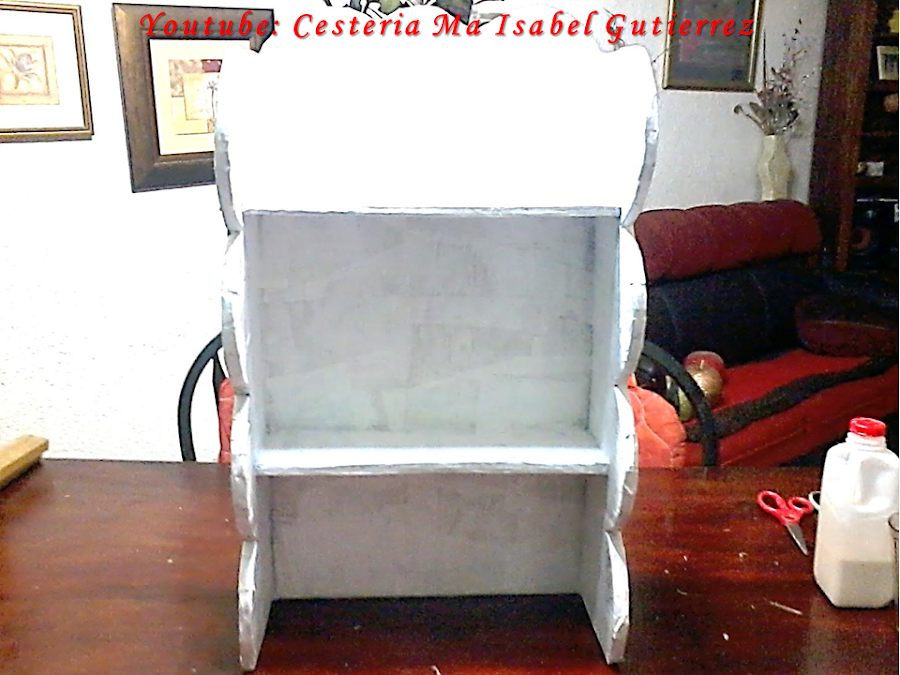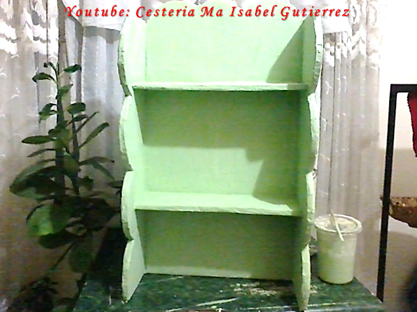 A continuación, vamos a hacer cartapesta a toda la repisa, pegando pedazos pequeños de cualquier papel, éste deben ser cortado con las manos y no con tijeras, para que al terminar no se noten mucho los relieves... Pegamos dos capas de cartapesta, con una mezcla muy aguada de pegamento o cola blanca con agua.