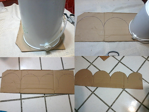 De la misma manera que hicimos la parte ondulada de la pieza principal, vamos a hacer los laterales. Con otro recipiente un poco mas grande, empezamos a dibujar círculos completos sobre el cartón que será pieza lateral, a mi me resultaron tres círculos completos y el cuarto a medias. Recortamos por la línea externa de los círculos y ya está, ya tenemos una pieza lateral. Necesitamos seis piezas como esta, ya que cada lateral lleva tres. Pegamos tres piezas entre sí para un lateral y otras tres piezas para la segunda lateral.