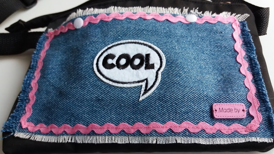 Preparamos el bolsillito exterior, yo lo he hecho poniendo cinta zigzag alrededor y un aplique, luego he deshilachado un poco los bordes, también le hemos puesto los broches a presión y el resultado es este: