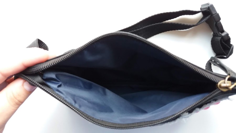 Abrimos la cremallera a la mitad y con la correa dentro, cosemos por todo el borde, y dejamos en la parte del forro unos 10 cm aprox. sin coser porque por esta abertura le daremos la vuelta al bolso.