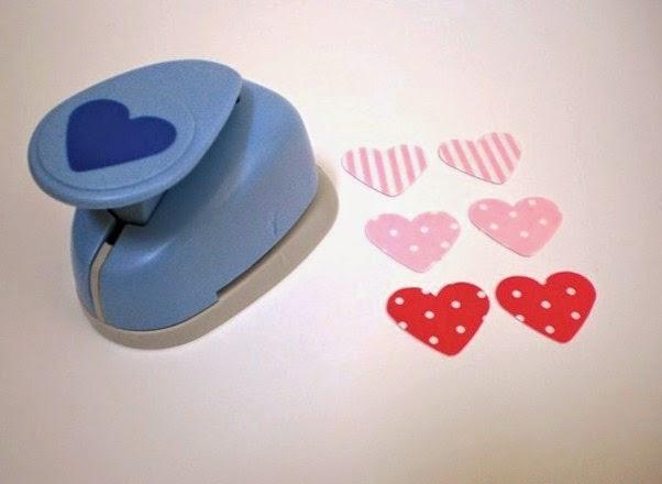 Lo primero que hacemos es, si tenemos un troquelador mejor, sino dibujen corazoncitos en la cartulina estampada y recorten.