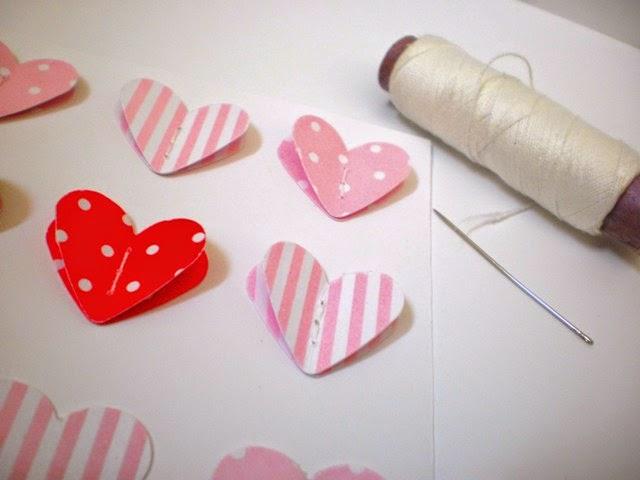 A los demás corazones que tenemos, los doblamos al medio, para darles la forma que vemos mas arriba y los costuramos por en cima de los que están pegados a la cartulina
