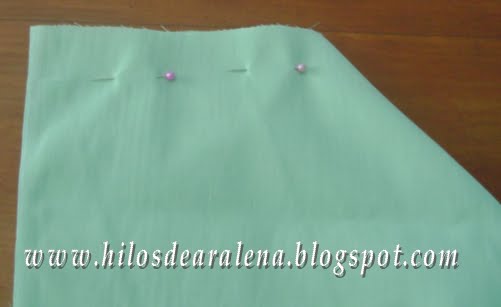 Por allí pasamos un elástico para fruncir, en la parte superior e inferior, empezando unos 15 cm antes de la costura del ángulo y terminando unos 15 cm después del 2º ángulo.