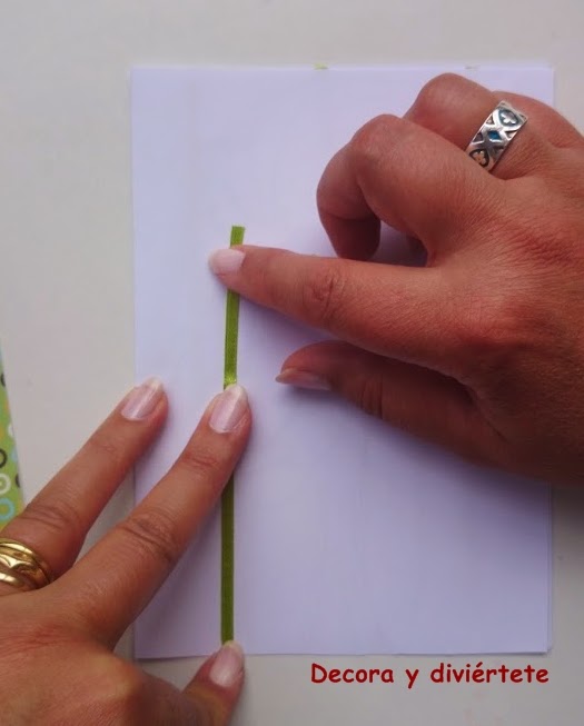 Lo primero es coger la cartulina que habéis escogido para hacer la tarjeta y doblarla por la mitad , la podéis hacer de la medida que queráis ... Yo en este caso la escogí de color blanco y empezáis poniéndole los tallos de las flores ( que son las cintas a diferentes alturas )