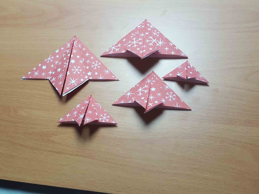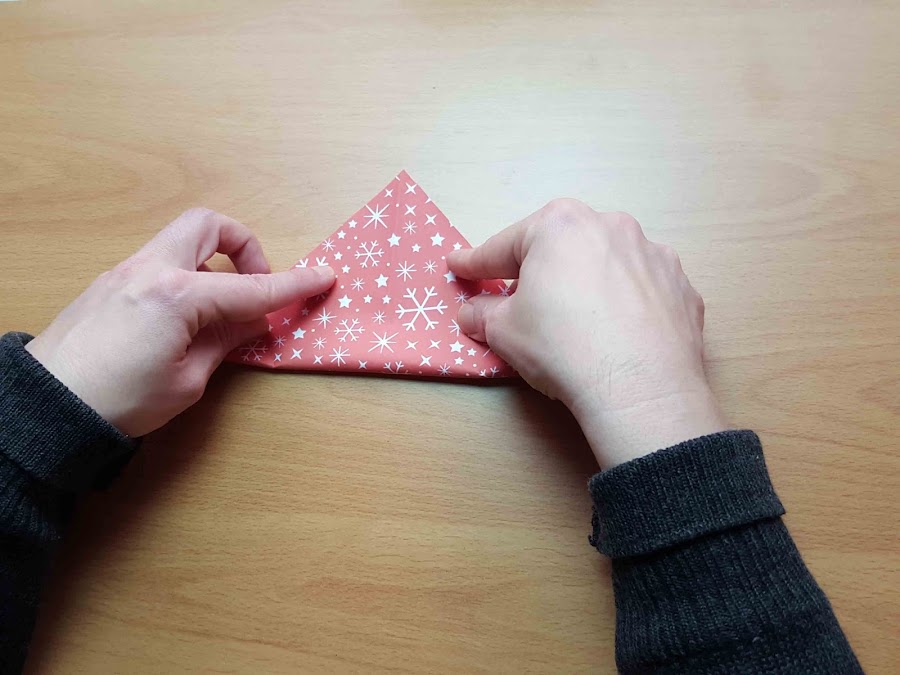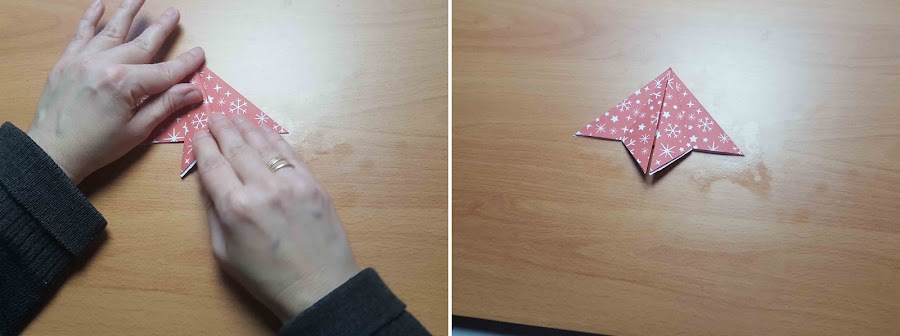 Se dobla finalmente hacia adentro los picos superiores del triangulo. Se hace lo mismo con los otros papeles.