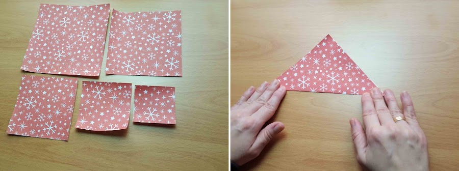 Cinco recortes de papel estampado o de regalo con las siguientes medidas: 6x6, 8x8, 10x10, 12x12, 14x14 cm.