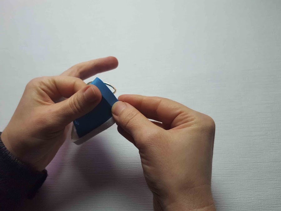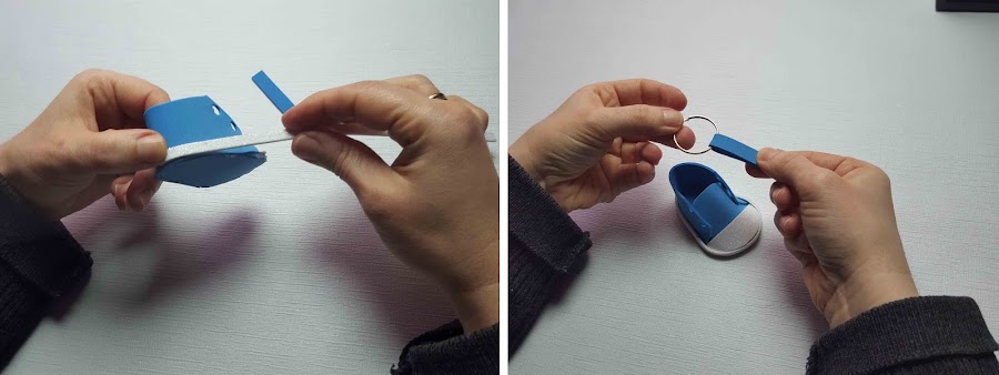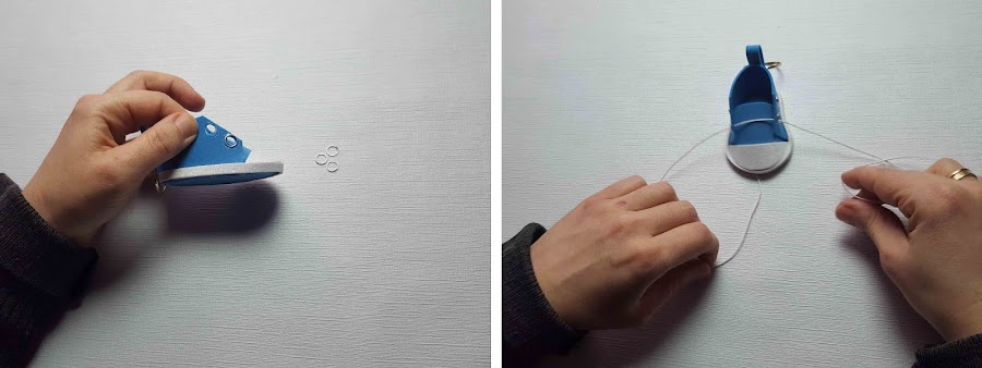Después la tira blanca alrededor de la zapatilla y le ponemos la anilla en la parte de atrás.