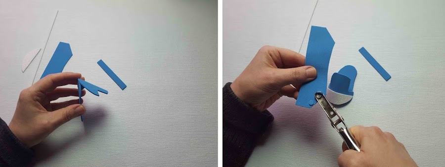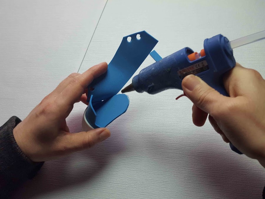 Pegamos las dos partes delanteras y después las de atrás, previamente le hacemos dos agujeros a cada lado a la parte trasera.