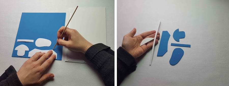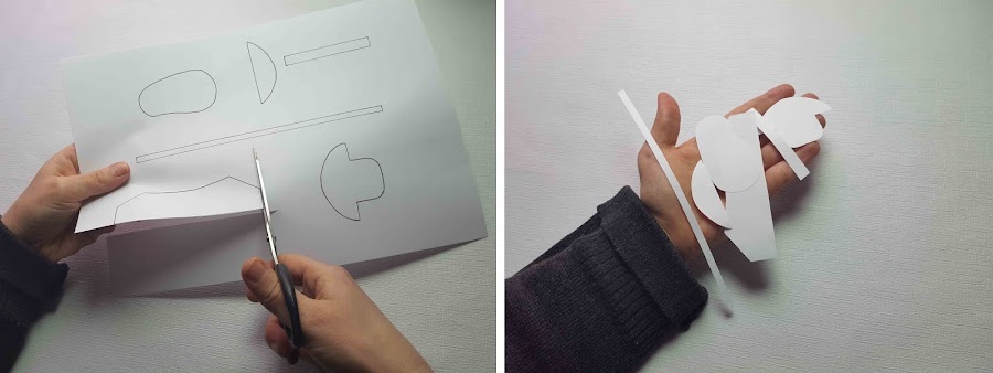 Empezaremos recortando las piezas de la plantilla y las ponemos encima de la goma eva. En la goma eva blanca Solo necesita dos piezas.