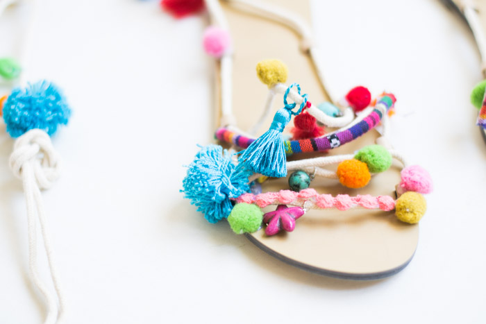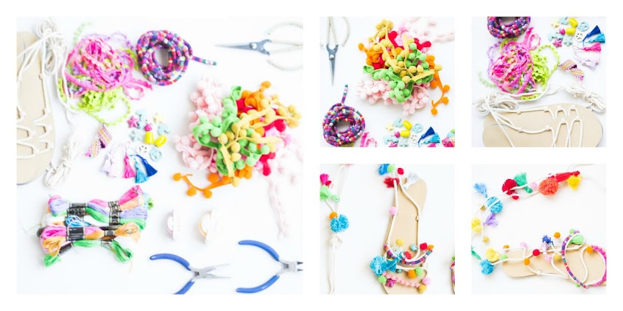 Materiales: Sandalias, tijeras, pegamento o cola caliente, lana, hilos de colores, abalorios, tiras étnicas, mini tassel etc.