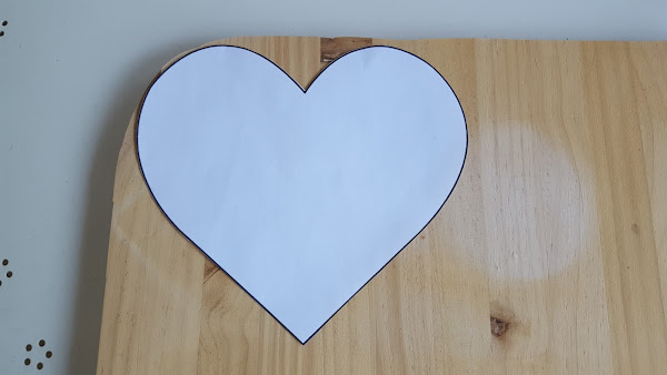 En primer lugar hice el molde interior en forma de corazón. Para ello, busqué en Internet una imágen en forma de corazón la edito para hacerla del tamaño deseado y la imprimo, recorto y coloco sobre el trozo de madera: