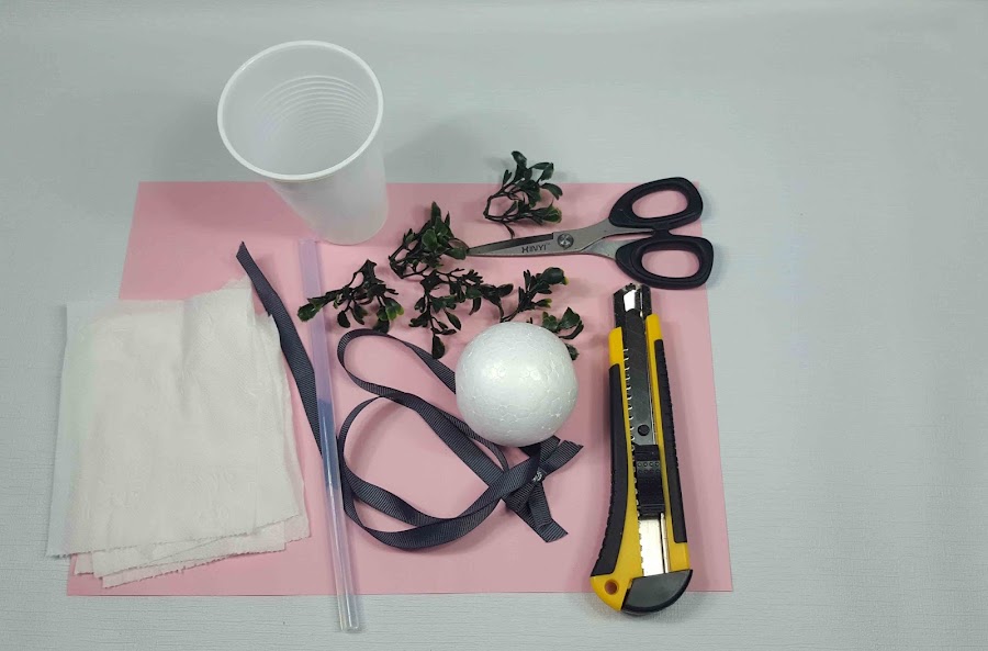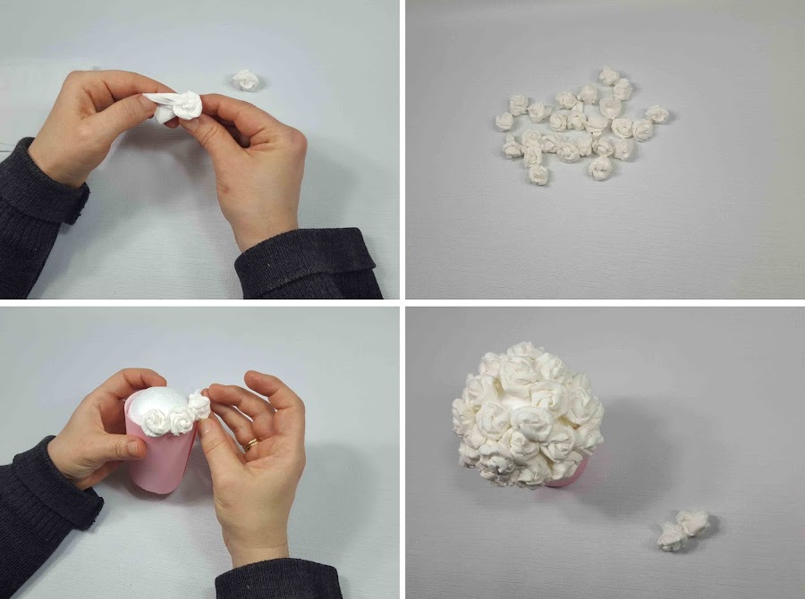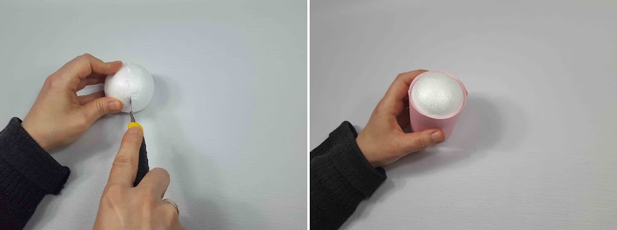Cortamos la bola de porexpan a la mitad y la pegamos dentro del vasito.