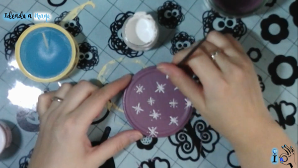 Y esta vela la vamos a poder tapar (cuándo esté apagada claro) porque he guardado la tapa del bote, que vamos a pintar igual que he hecho con la lata. En este caso, para que sea a juego con la vela la pinto de morado y le pinto luego unas estrellitas en blanco. La barnizamos y listo!