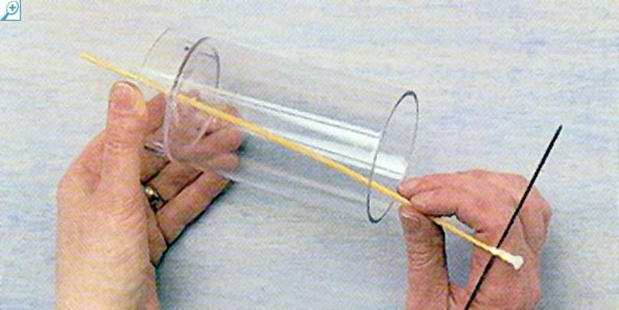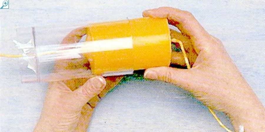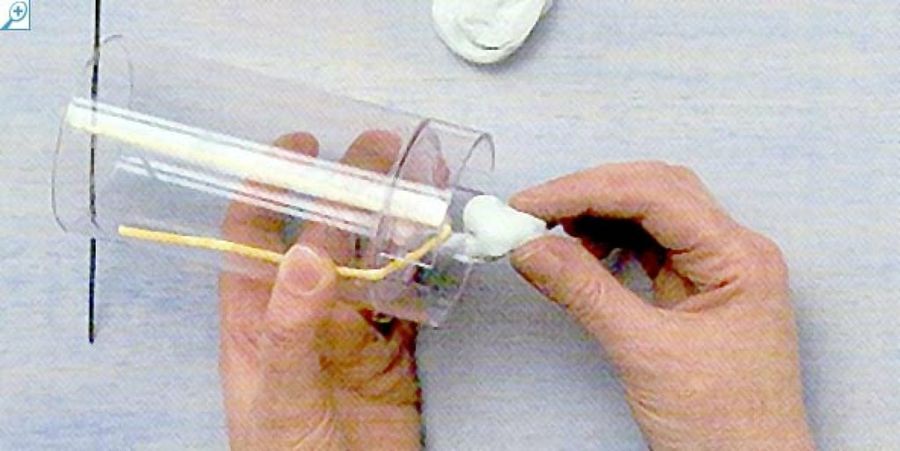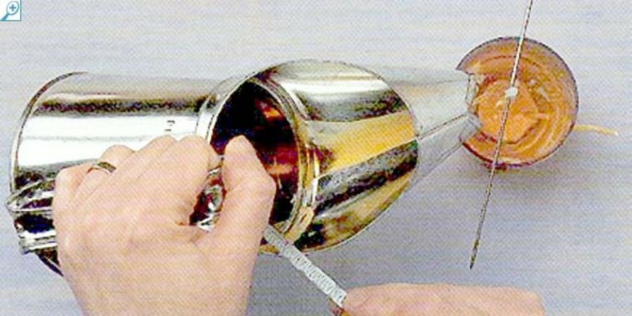 Con la aguja en la base del molde, tira firmemente de la mecha a través del pequeño orificio del fondo con la punta hacia el exterior del molde. Fija la mecha cubriendo el pequeño orificio con un poco de masilla de sellado. Comprueba que la masilla es impermeable introduciéndola antes en agua. La mecha deberá hallarse centrada y recta en el interior del molde.
