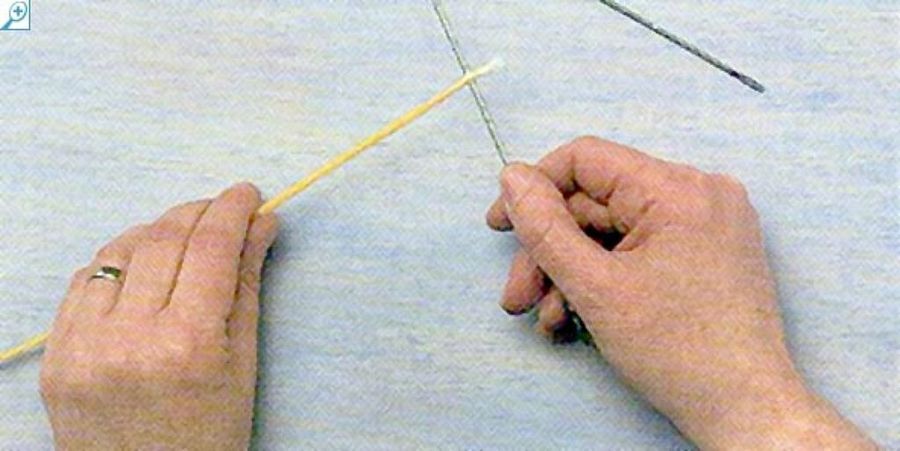 La punta encerada de la mecha almidonada siempre debe estar en el extremo de quemado de la vela. Cuando se endurezca, atraviesa el otro extremo de la mecha con una aguja como las descritas anteriormente.