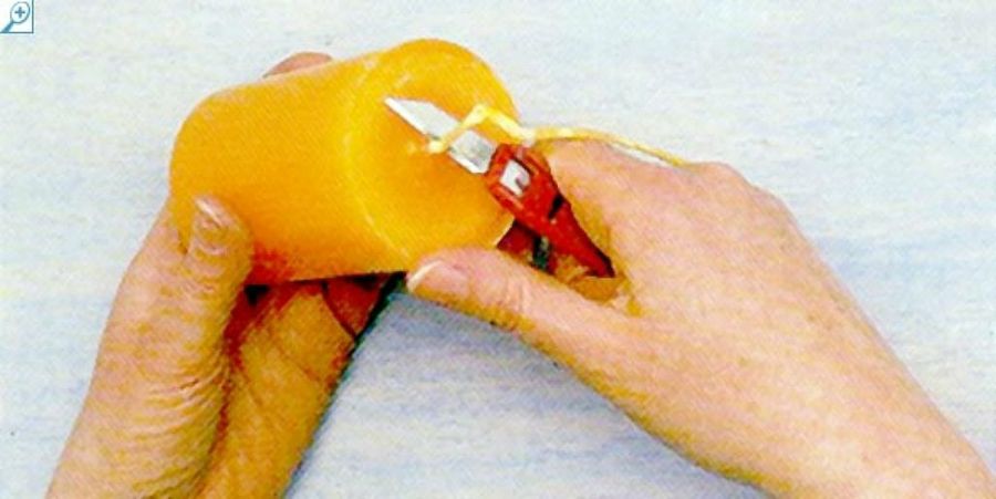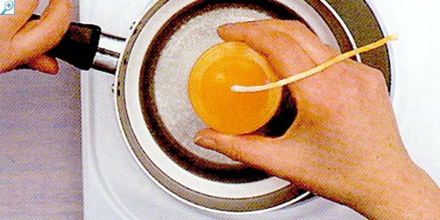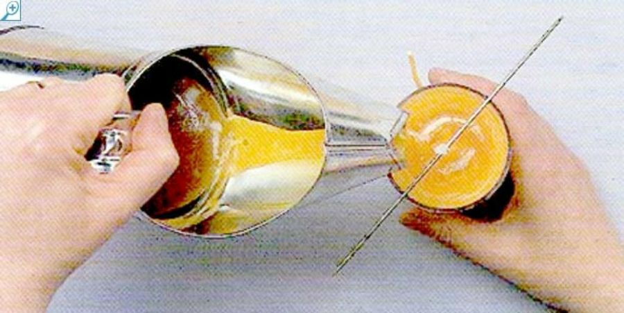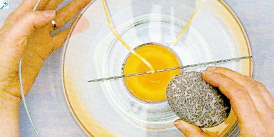 Corta una mecha de 5 cm. más que la altura del molde. Introduce la mecha en la cera fundida durante un minuto. Después tensa con los dedos y déjala reposar hasta que se seque.
