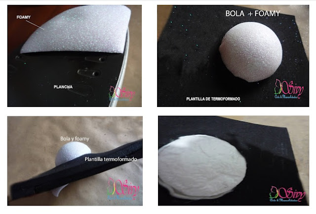 Calentamos sobre la plancha el pedazo de foamy (foto 1) y termoformamos; puedes ayudarte con una plantilla de termoformado como la mía, o puedes usar otros medio como la del vaso o simplemente dándole forma con la manos (ten cuidado de no quemarte)