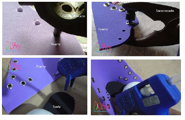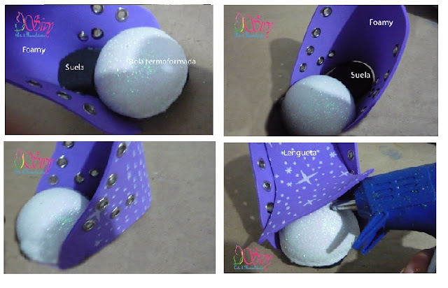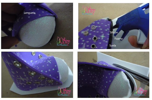 Tomamos el foamy del cuerpo del zapato, yo use uno con diseño pero en la foto lo ven lila llano porque lo tengo del lado contrario.