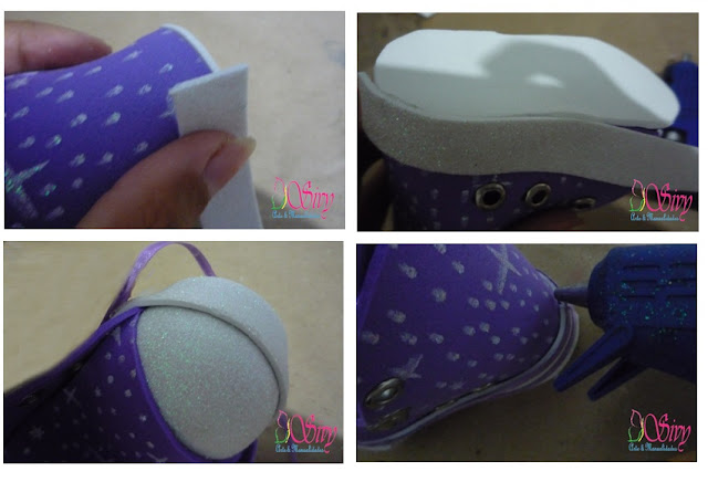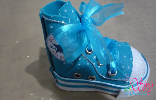 para que quede más cool, Imprime la marca de los zapatos convers y lo pegas a los costados y en la suela de atrás. Puedes adornarlo como tu desees, yo le agregue un cordón plateado en la parte superior.