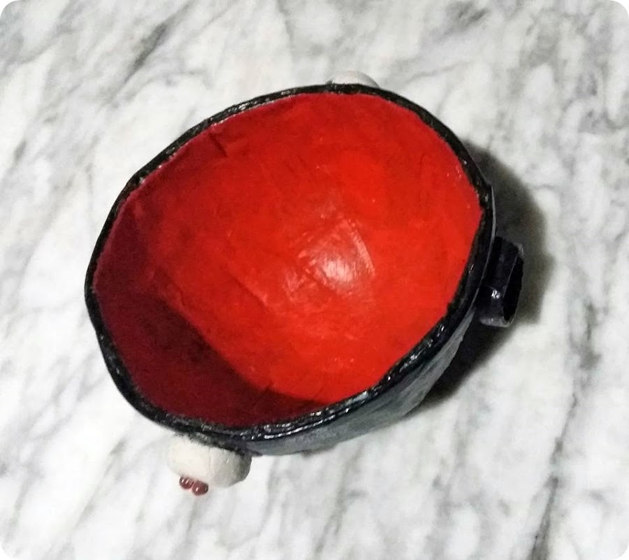 Barniz cerámico para las calaveras y el interior del caldero , así podrás utilizarlo como dulcero por ejemplo y podrás pasarle un pañito húmedo para limpiarlo.