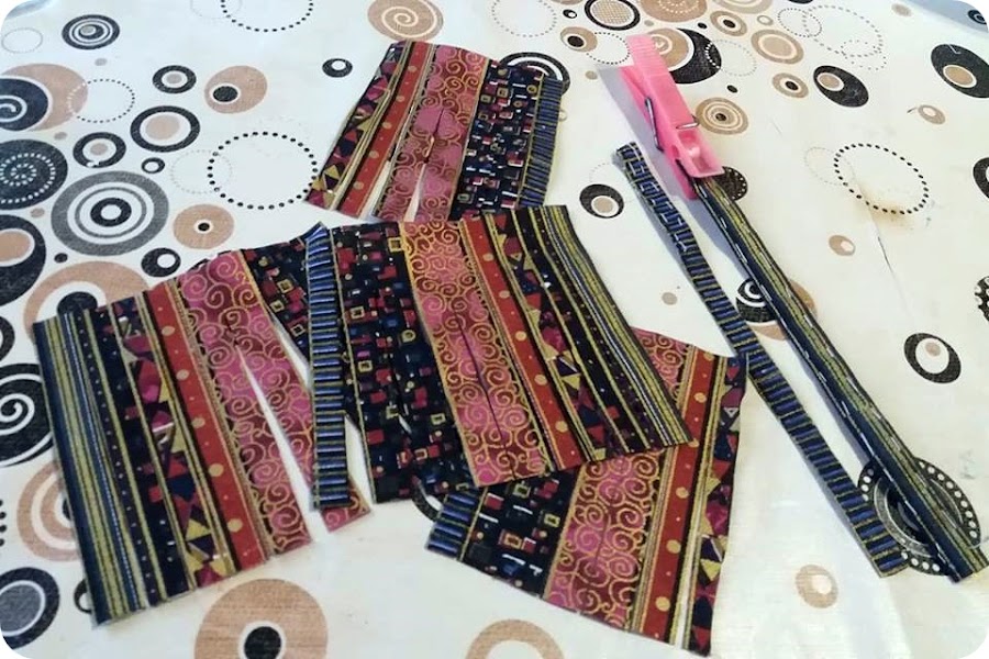 Este estampado me va ayudar a cortar las tiras , así que para la borla recorto las tiras hasta un centímetro del borde , enrrollo sobre ese borde hasta alcanzar el tamaño que creo que me viene bien y le doy unas puntaditas para que no pierda la forma , luego le daré unas vueltas con otra tira para dejarlo bien rematado.