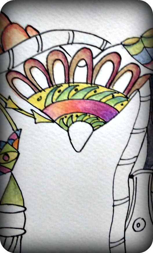 He sombreado el contorno del dibujo a modo de sombras, o de nubes , no se , el caso es que no quería el fondo blanco , y lo he " ensuciado "con colores a tono con el conjunto.