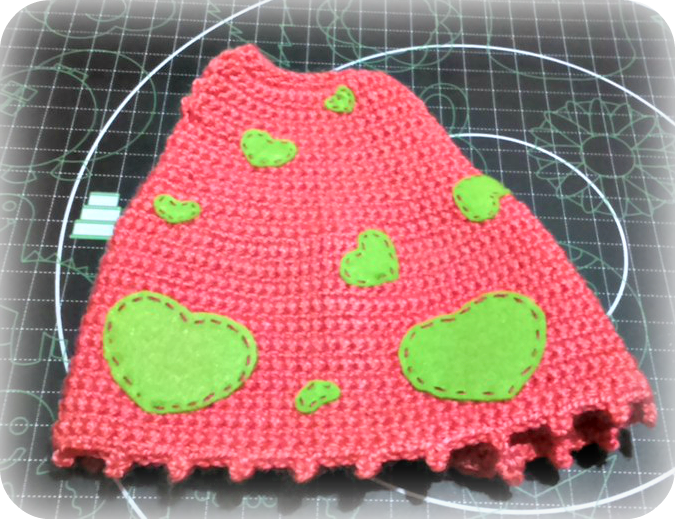 Le damos las puntadas alrededor de todo el corazón y lo vamos cosiendo de esta manera al vestido , con la precaución de dejar la parte superior libre , para que estos corazones hagan las veces de bolsillos.