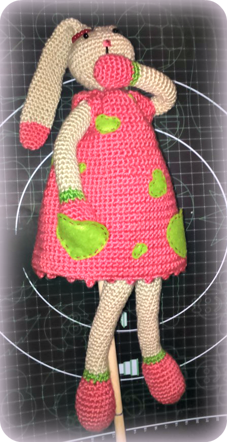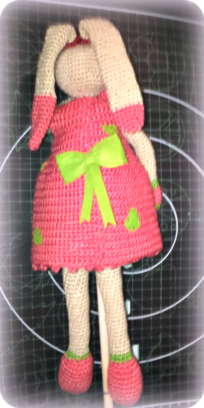 En el cuello pasaremos una hebra con puntadas cortas para en el momento de asentarlo sobre la conejita , podamos hacer un ligero frunce si es necesario acomodarlo , y rematamos.