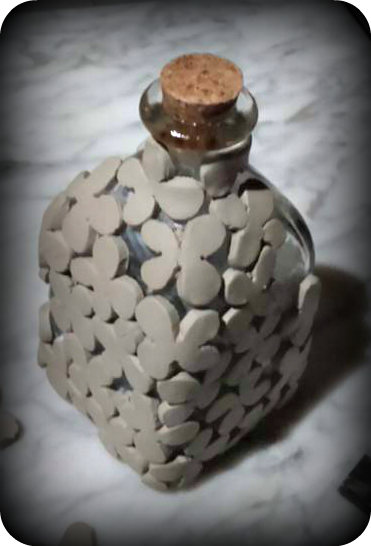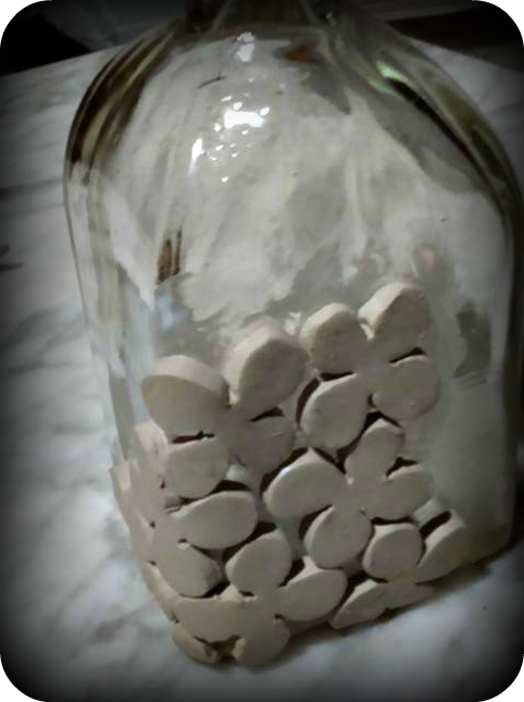 Voy pegando con cola blanca las flores de arcilla sobre la botellas , para que de esta manera la flor tome la forma de la botella según se seca.