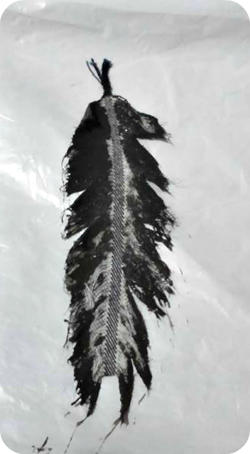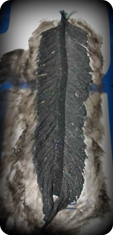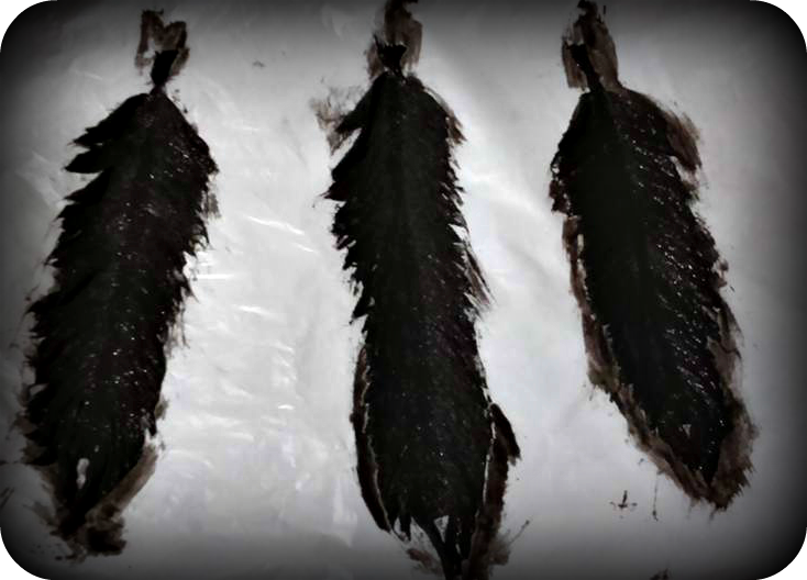 Le aplico a toda la pieza el acrílico negro , (al que he añadido un poco de cola y agua ) a la vez que le aplico el color , le voy dando la forma , de manera que en el extremo inferior se juntan los hilos , esta es la que realmente le dará apariencia de pluma .