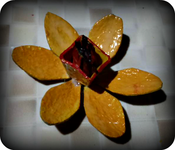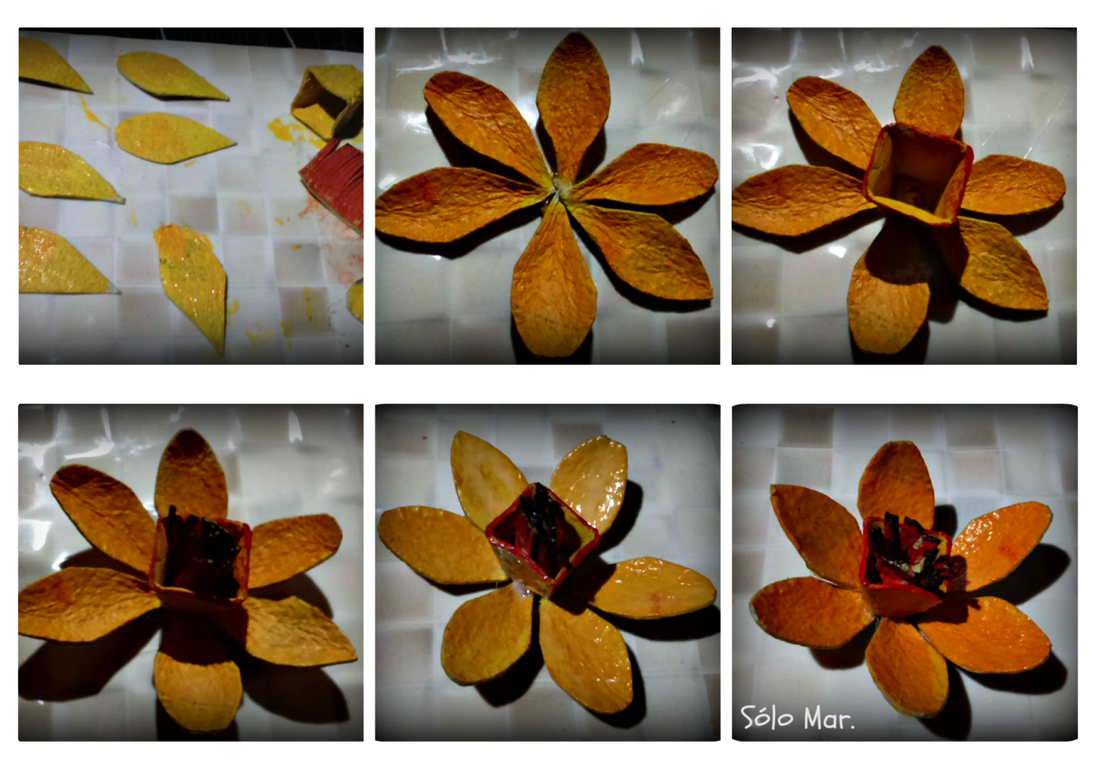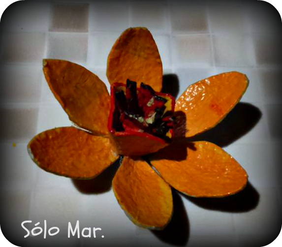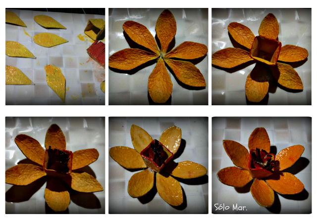Con la parte lisa del cartón recortamos seis pétalos , con la forma similar a la que veis en la foto ( luego vuestra creatividad también puede jugar eh?.....)