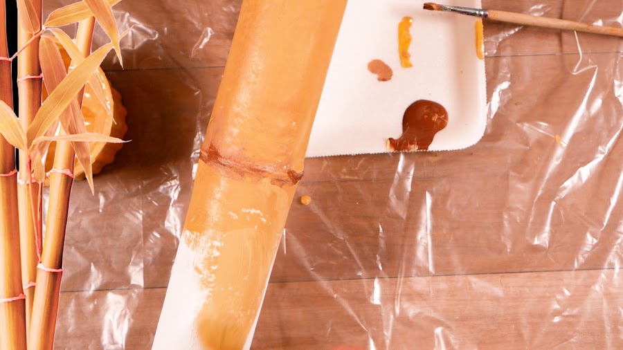 Solo con color chocolate aplicado alrededor de los mismos y suavizado hacia arriba y abajo aprovechando la pintura de base aún fresca y dejando manchas imitando las cañas de la foto.