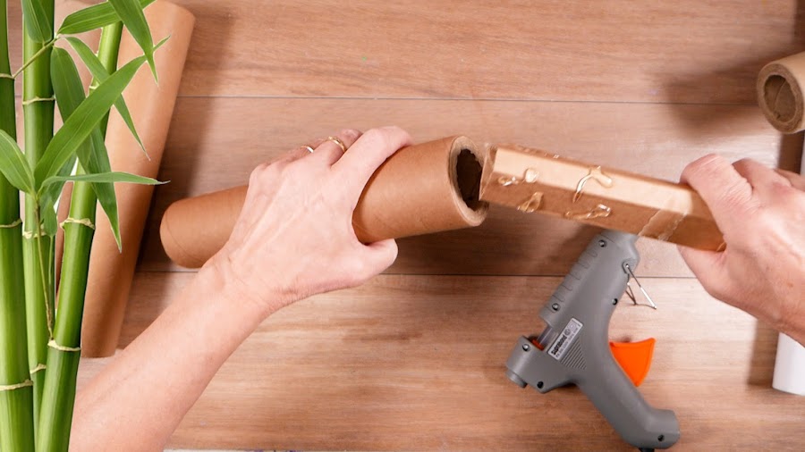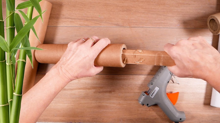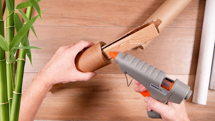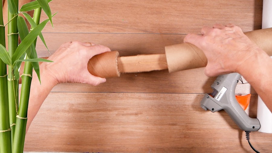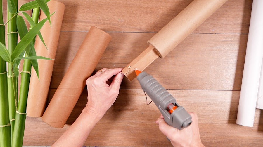 Para que queden bien firmes, coloco silicona caliente en un extremo del rollo de cartón y lo introduzco por la mitad dentro de un cilindro.