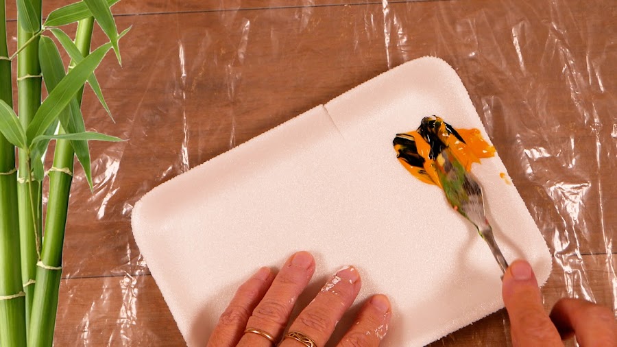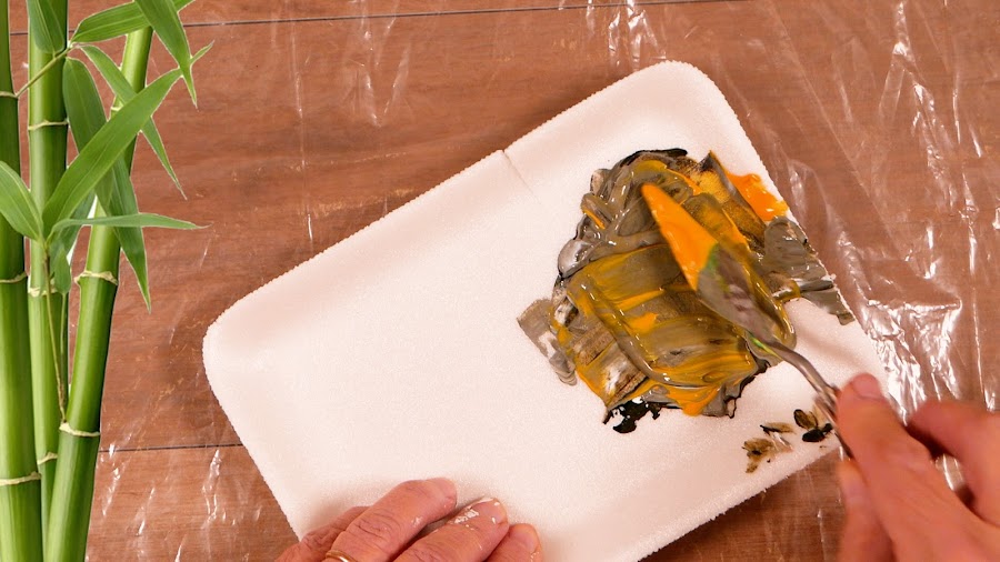 Mezcle pintura acrílica amarillo oro, un poco de negro y comencé a mezclar, a esta mezcle le incorporé blanco y un poco mas de amarillo y seguí mezclando, y un poco mas de amarillo varias veces hasta obtener el verde deseado.