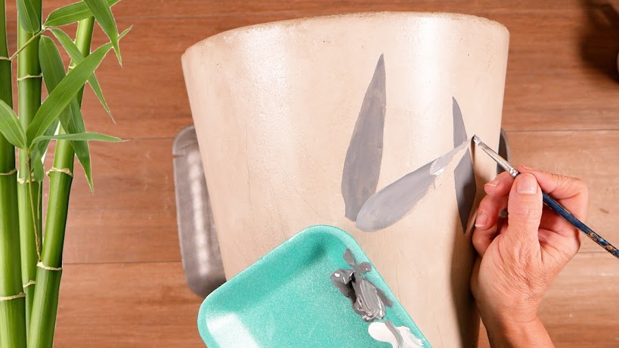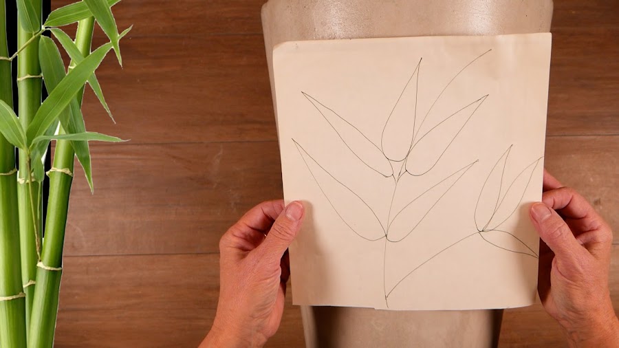 Como recipiente para lucirlas elegí para estas cañas una maceta de cemento de forma cónica, le apliqué una mano de barniz brillante al agua y sobre ella pinto de manera simple algunas hojas de bambú. Realicé un dibujo para que ustedes se den una idea de lo que quiero hacer,