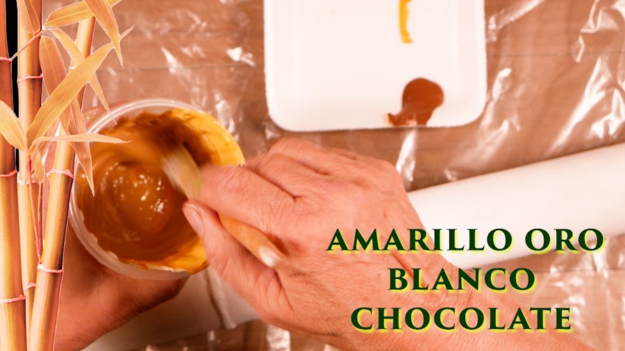 Mezclo amarillo oro con pintura acrílica blanca y en otra parte coloco color chocolate solo. Sigo agregando blanco al amarillo , como el amarillo que utilizo es muy intenso le agrego un poco de color chocolate y blanco y sigo mezclando.