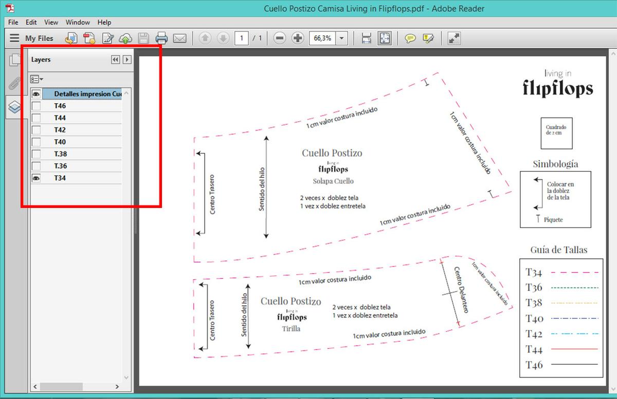 Es importante que siempre imprimas la capa Detalles de impresión, sin ella no tendrás ninguna guía en el patrón (piquetes, sentido del hilo…)