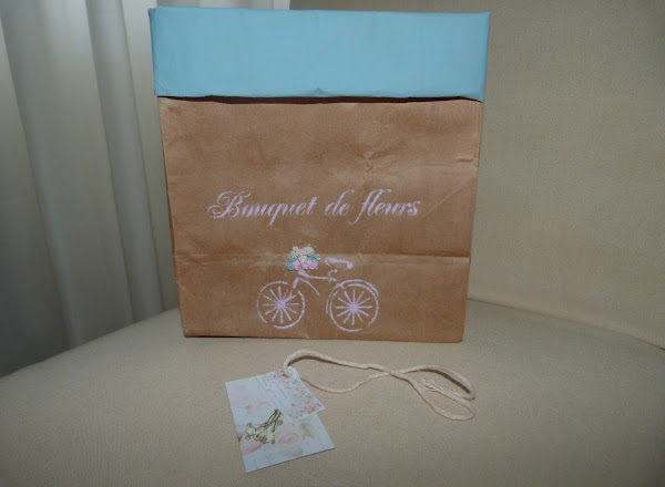Y ya que tenía las hortensias, decidí hacer un recipiente bonito para ellas utilizando otra bolsa de papel kraft usada que tenía en casa. Di unas vueltas a la parte superior y la pinté en verde aguamarina. Después, estarcí una frase y una bicicleta vintage rosa pálido.
